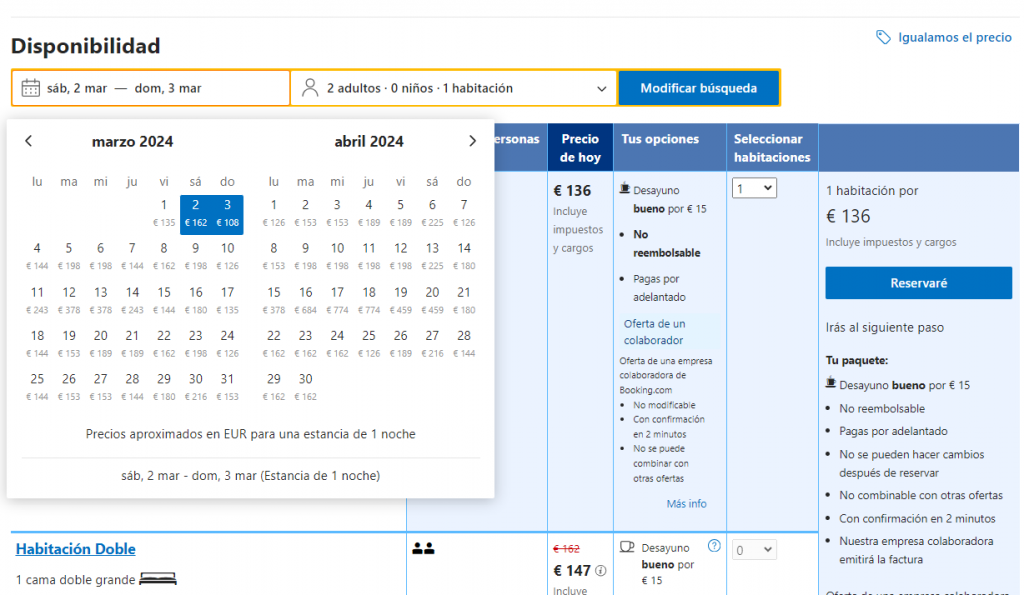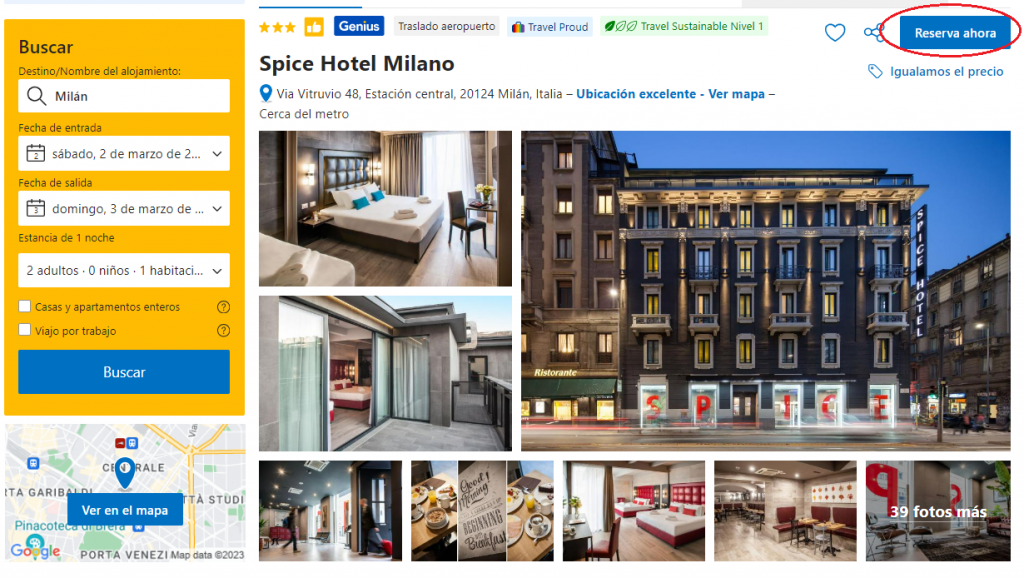 Por ejemplo, imagina que queremos reservar este hotel de Milán de 2 al 3 de Marzo de 2024 (foto de arriba). Nos vamos a la casilla de Reservar ahora donde nos da las opciones que tenemos de precio según condiciones de la habitación, política de cancelación, etc.