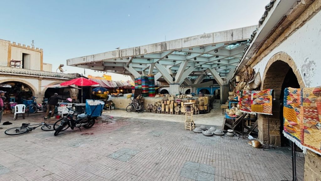 Todos los puntos de la ciudad están muy cerca unos de otros por lo que podrás realizar todo con mucha calma. Supongamos que empiezas tu día por Essaouira por la mañana, te recomendamos empezar la ruta visitando La Place du Marché aux Grains, también conocida como Souk Laghzal, se trata de una plaza encantadora llena de vida local, donde podrás encontrar desde productos frescos hasta artesanía. De hecho, encontrarás el famoso fish market, el famoso mercado del pescado, dónde encontrarás una gran variedad de pescado y marisco fresco, pescado en el día directamente del océano atlántico.