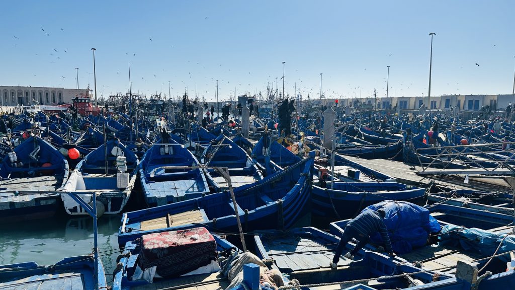 Continua por la misma avenida todo recto durante 10 minutos, hasta llegar a bordear la playa, y encontrarás el puerto de Essaouira, uno de los puntos más emblemáticos de la ciudad.El puerto fue fundado en el siglo XVIII y es conocido por su arquitectura histórica y su importancia en la tradición pesquera de Marruecos. Este puerto es el corazón de la actividad comercial y de la vida local, donde los pescadores traen diariamente el pescado fresco.